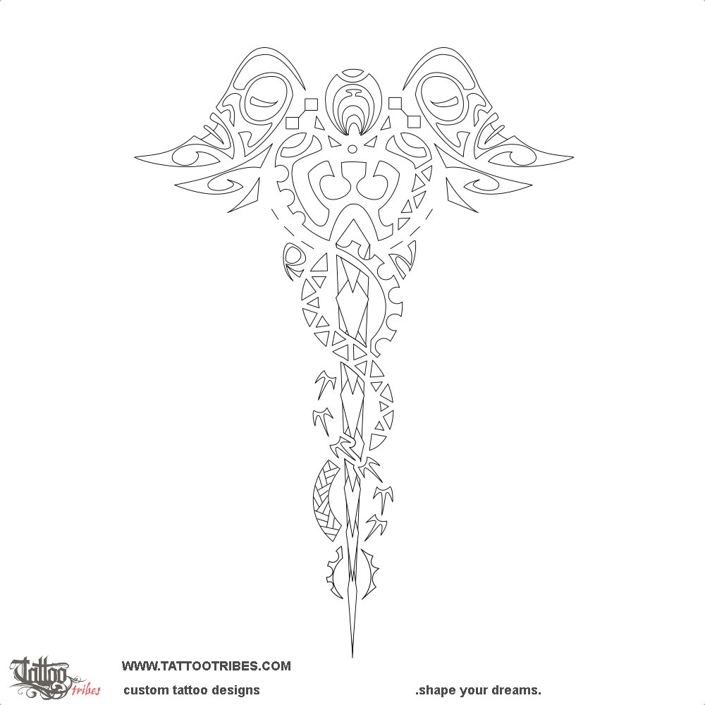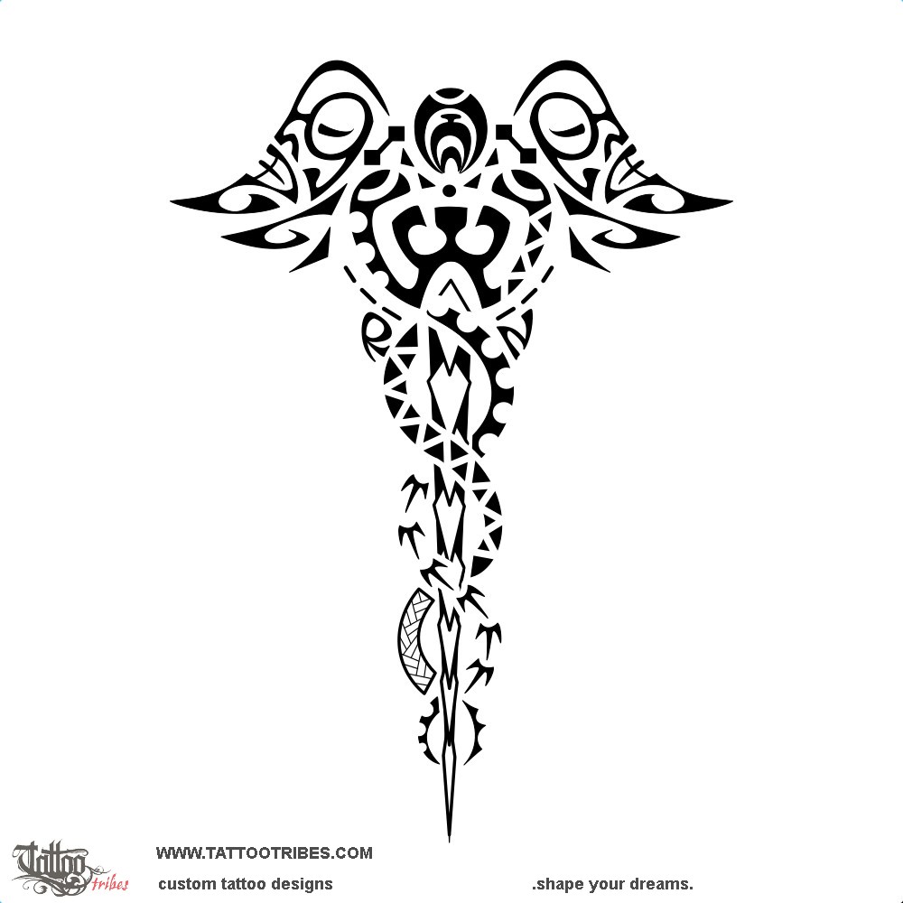 This Polynesian styled caduceus tattoo was prepared for Noel, to celebrate a goal reached at the end of a voyage (the row of birds) that he faced with strength, tenacity, and adaptability (octopus tentacle and shark teeth).