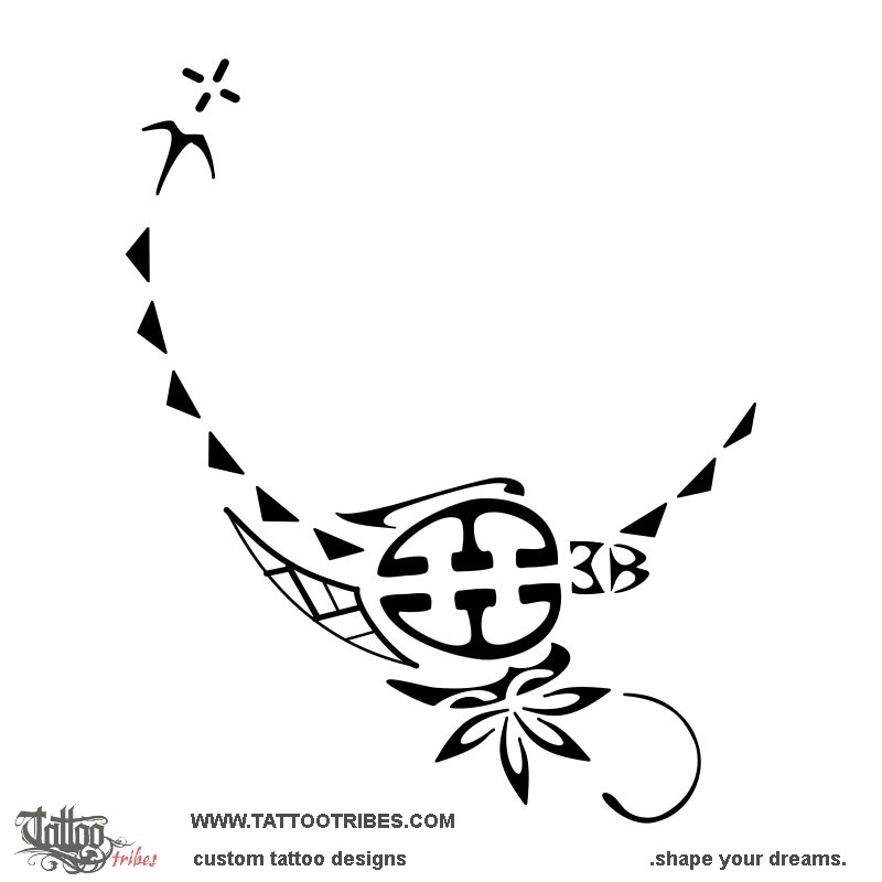 This small Polynesian tattoo for the ankle was prepared for Stephanie and it is shaped to recall a scorpion, as it's a symbol of passion, with a small turtle shaped by the couple to symbolize family, and with the head of the turtle shaped by the letter M.