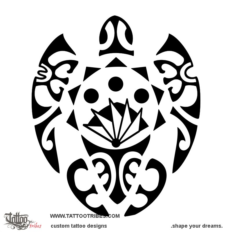 This simple Polynesian turtle tattoo was prepared for Cristiano and it symbolizes his family: the three dots above the flax leaves (family union) and a stylized T between tiki hands for protection symbolizes three children, protected between the parents placed on the front flippers of the turtle.