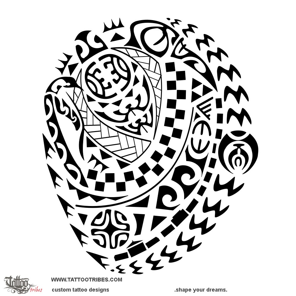 This Polynesian tattoo for the shoulder was prepared for Simon, and it has a turtle in the center to symbolize the importance of family: on the shell the couple is protecting and nurturing two children below (on the front flippers there are a tiki for protection and a penguin for nurturing).