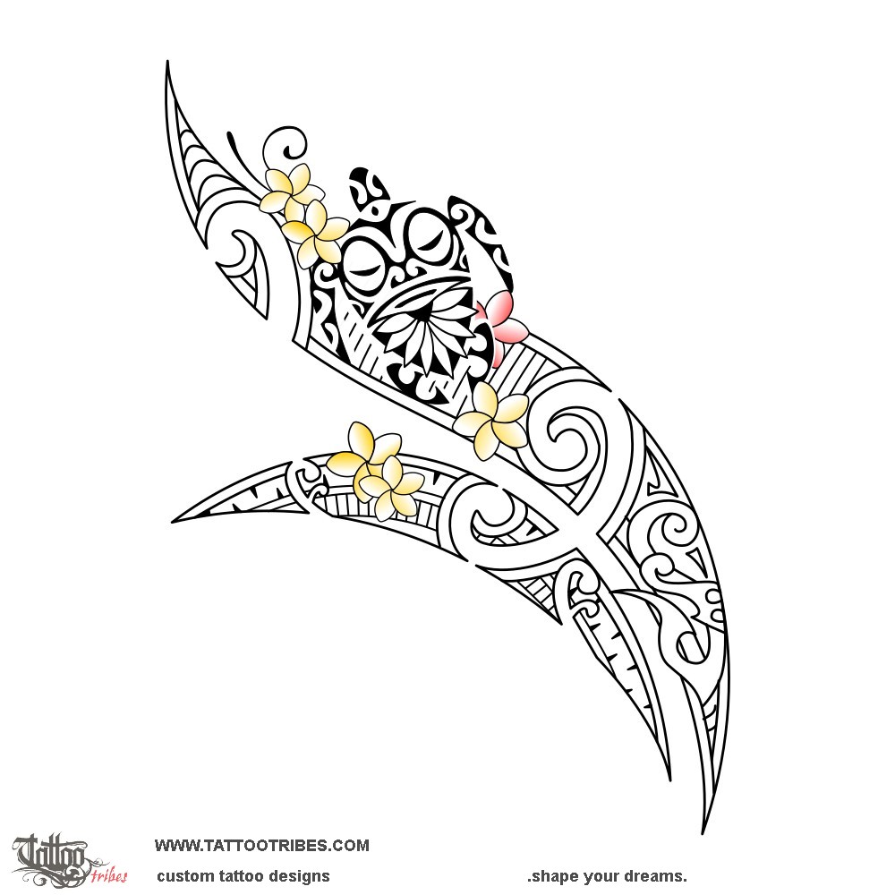 Several plumeria flowers surround the turtle, and the koru symbolizef
