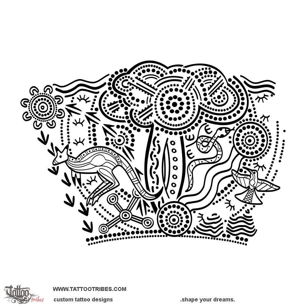 Other traditional elements around the tree are a honey ants site, waterholes connected by running water, and a campsite with people around it.