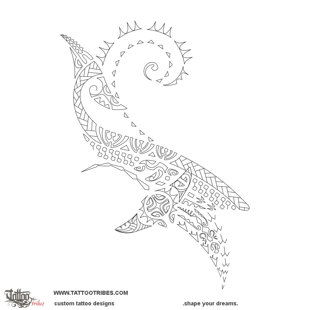 The pectoral fin of the whale is shaped by a manta, a symbol of beauty and freedom, and we placed some elements in it to represent strength, courage (spearheads), and tenacity (the hammerhead shark motif), which will bring joy (the sun), balance, and harmony (the Marquesan cross).