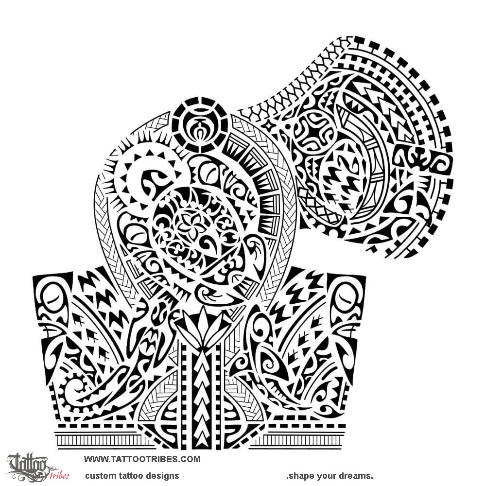 The front flippers are tiki for protection, the lower part of the shell includes Kena as a symbol of the warrior who protects them, and the rear flippers are shells for affection and loyal love.