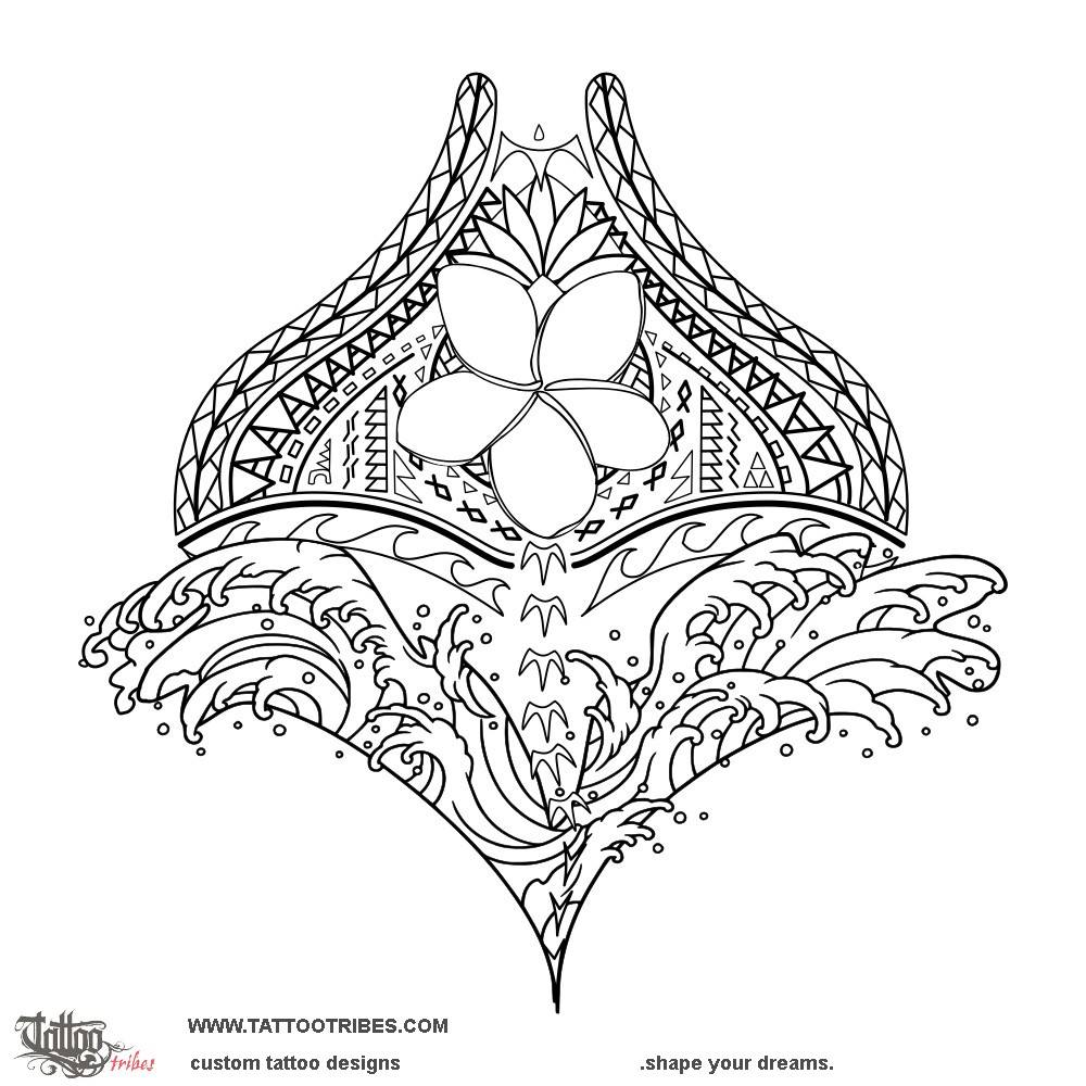 This Polynesian manta tattoo designed for Ezra'a back blends Polynesian elements, mostly Samoan, with more realistic parts like the central flower of plumeria and the Japanese-styled waves of the lower part.