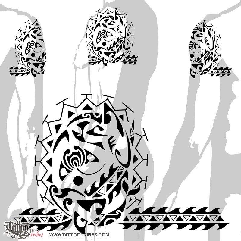 We called tuakiri, that is personality, this tattoo requested by Alessio because it represents his character; waves forming the armband and the sun want to represent his life going on, with all the changes and events he comes across, and through his life two aspects of his personality alternate: the dolphin that symbolizes joy, friendship, games, and the shark that symbolizes strength and adaptability. The dolphin contains the shark teeth motif and the shark has a symbol of meeting inside because they are two sides of a single character and they can´t be separated. Romantic and strong, loving the sea and having company. The manta symbolizes elegance and freedom, the fish hook, or matau, is a symbol of wealth and the "all seeing eye" is a symbol of protection to scare enemies away.