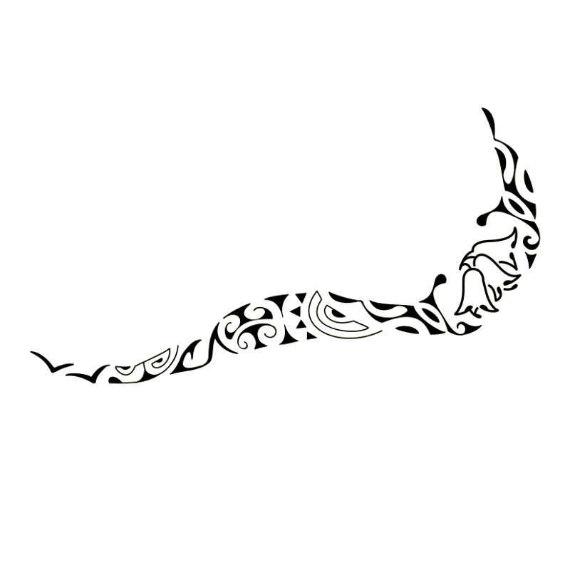To symbolize pain we user stylized hyacinth flowers (hyacynth symbolizes pain and is dedicated to sports) enclosed in a manta to represent freedom from pain. This change (waves) and her determination (mango pare motifs) will bring the sun back, along with prosperity (matau), luck (lizard) and safety (seagulls).