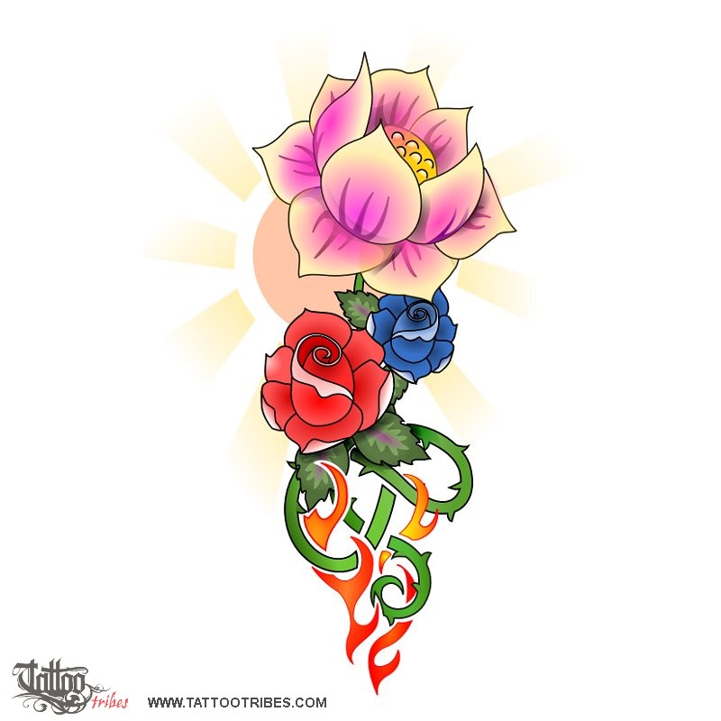 From here, with the help of her mother (the red rose = love) and of her friends (the blue rose = hope, just like the leaves of the roses), she reached the start of her new life (the sun which is pink instead of golden to represent the dawn of this new "day", where the lotus flower represents overcoming the adversities towards a perfect new life.