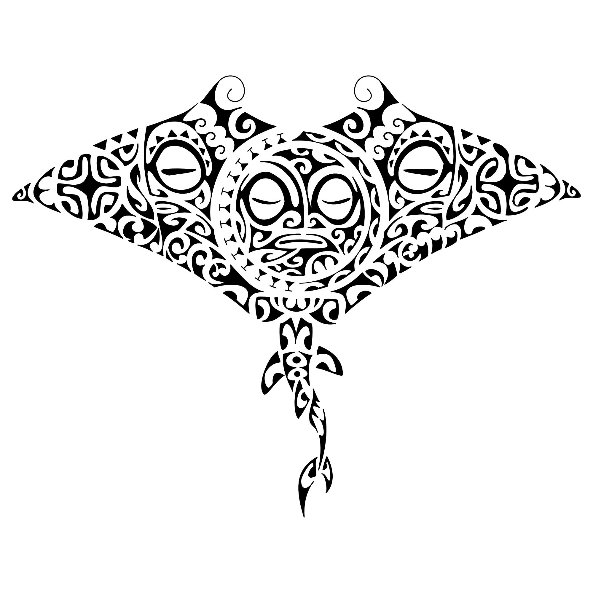 The lower part of the manta wings, on the sides of the hammerhead shark, include two maorigrams of the words "carpe" (on the left) and "diem" (on the right).