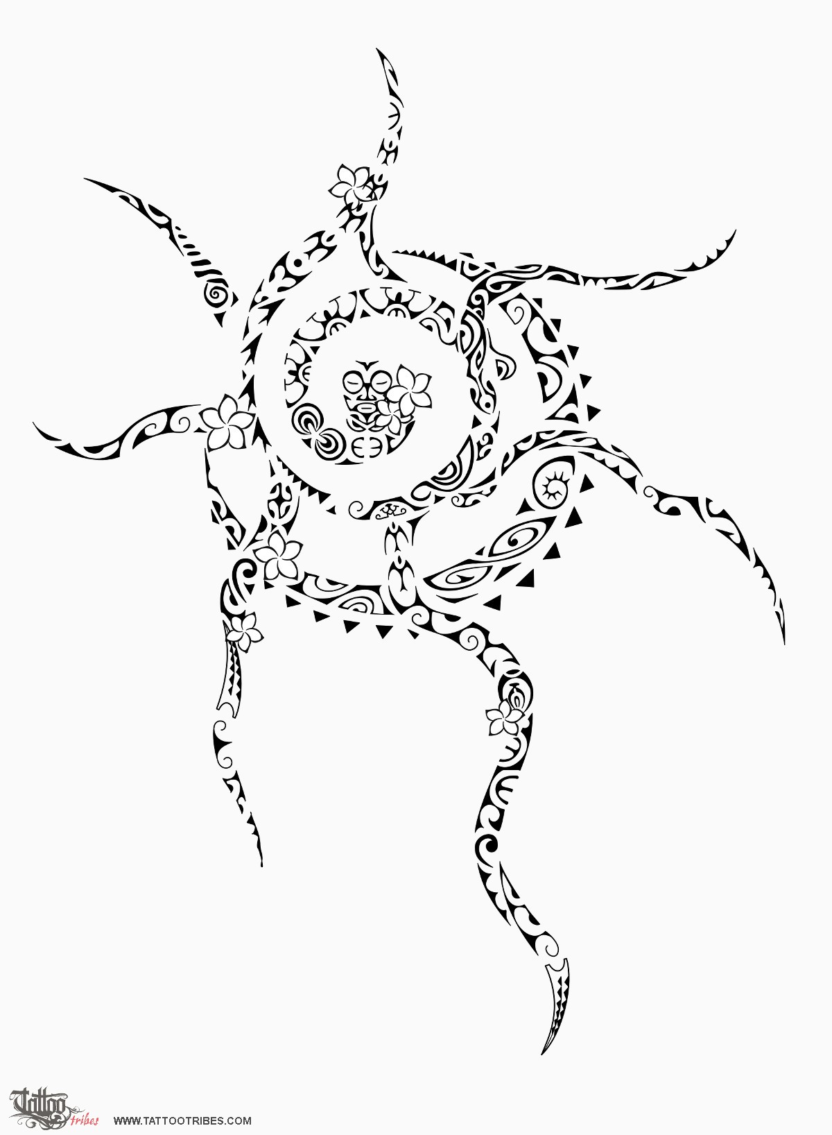 Ray 2) again adaptability and tenacity (the hammerhead shark motif) to defeat hard times (moray eel) for a new life (the koru) of beauty (flower), harmony and balance (the Marquesan cross).