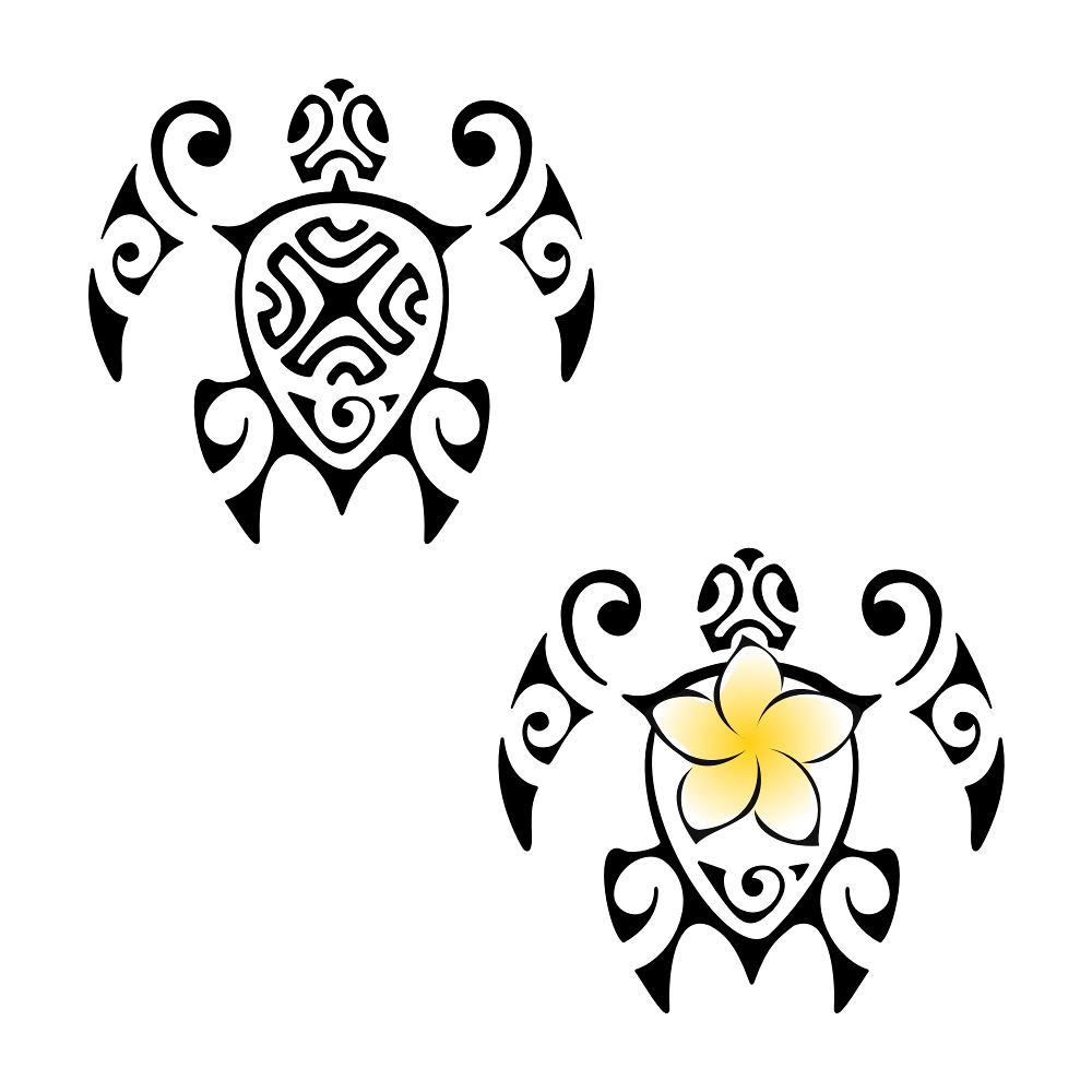 One turtle has a Marquesan cross and the other one has a frangipani flower (beauty, safe shelter) on their shell.