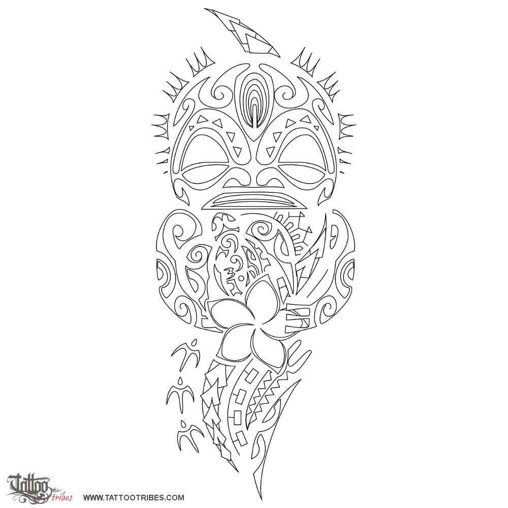 Alessandro requested a tiki design representing his mother (the frangipani flower symbolizes femininity) and the voyage that makes her become the protector of their family (she holds in her arms a turtle symbolizing familly). The manaia on the turtle´s shell underlines her role as a guardian angel.