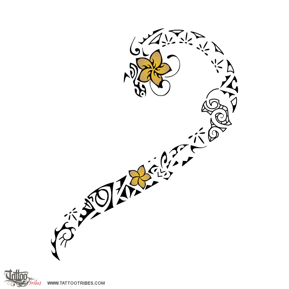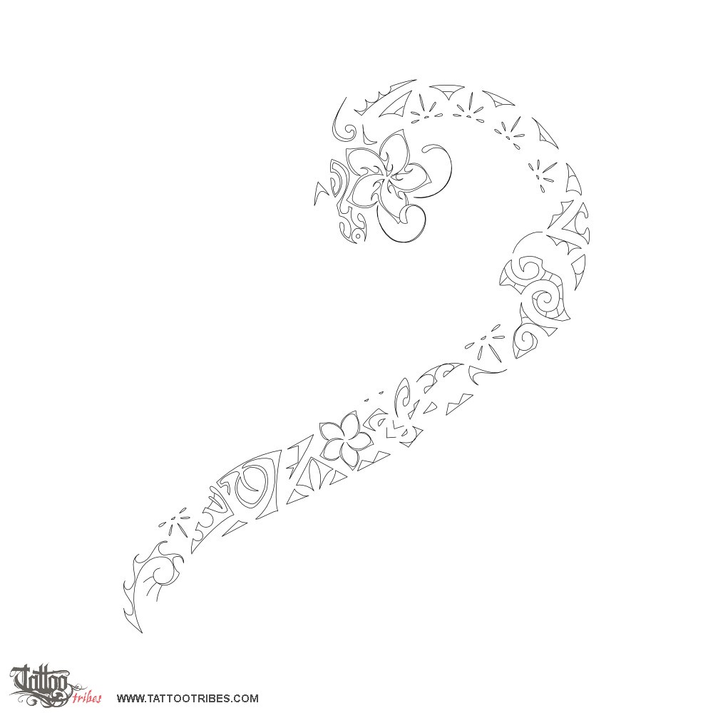 The flowers of frangipani (beauty, femininity) and a Fijian version of the flax leaves motif (family) make the tattoo gentler and more feminine.