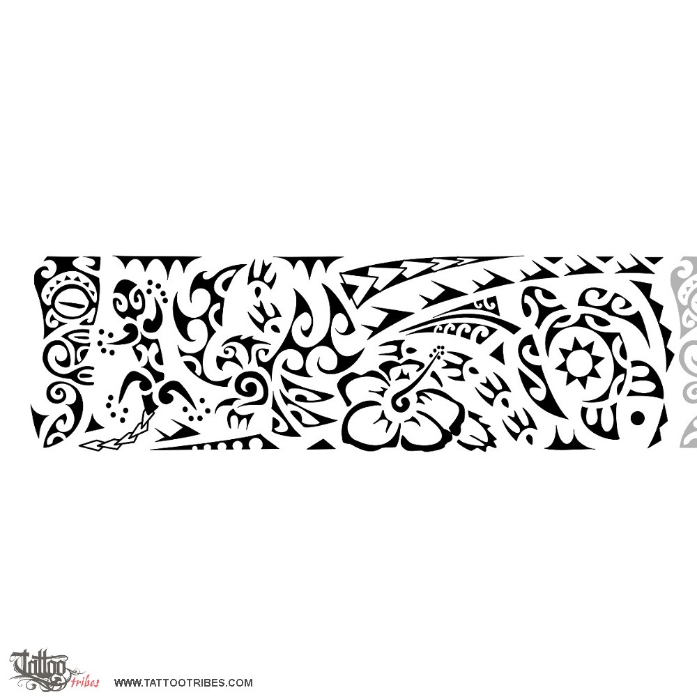 Other elements are the hibiscus flower (carpe diem), a fern frond (maturity) and a turtle (family) with a sunmoon being its shell.