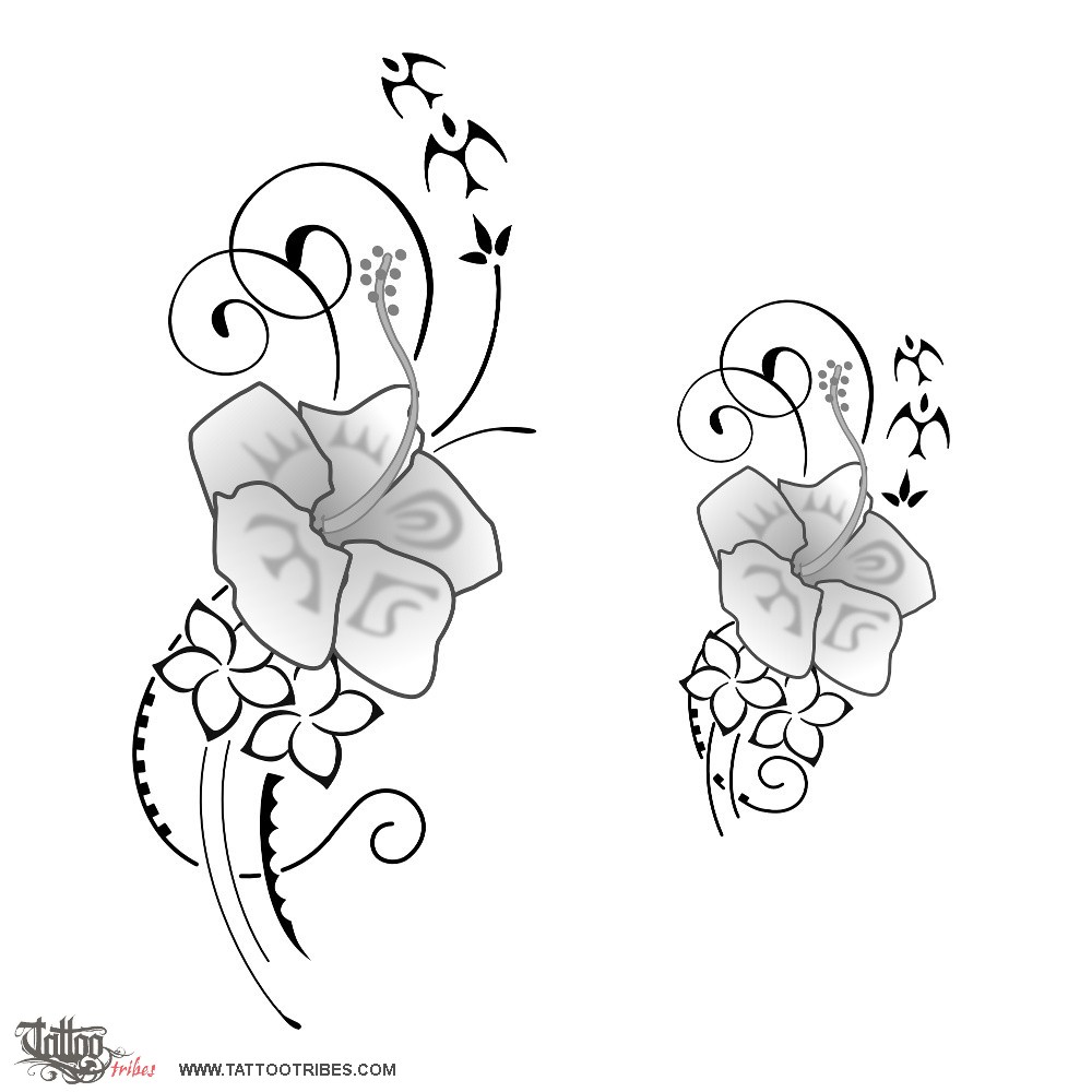 Inside the hibiscus there are a tiki eye and hand (protection), an ipu (femininity) and a sun shaped by mountains (joy and stability).