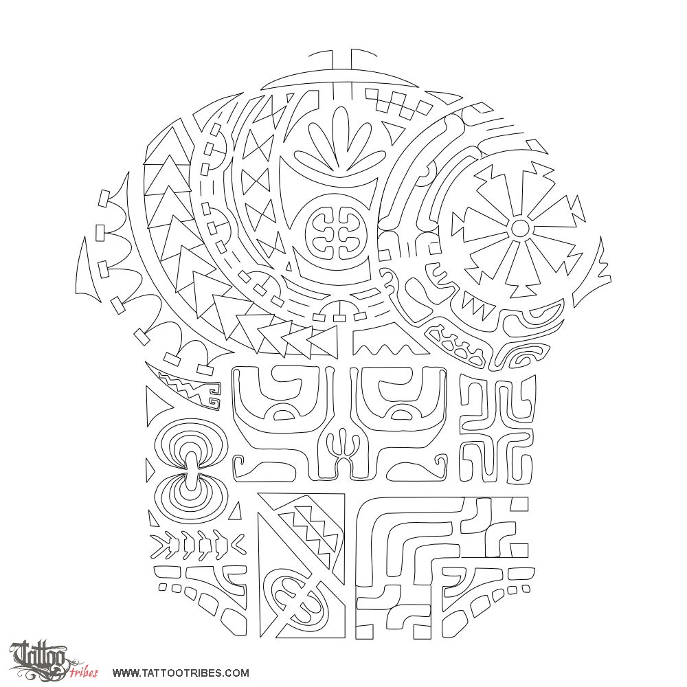The centipede and spear heads symbolize the warrior facing adversities (the moray eel) to reach success and serenity (the sun and Marquesan cross towards the future).