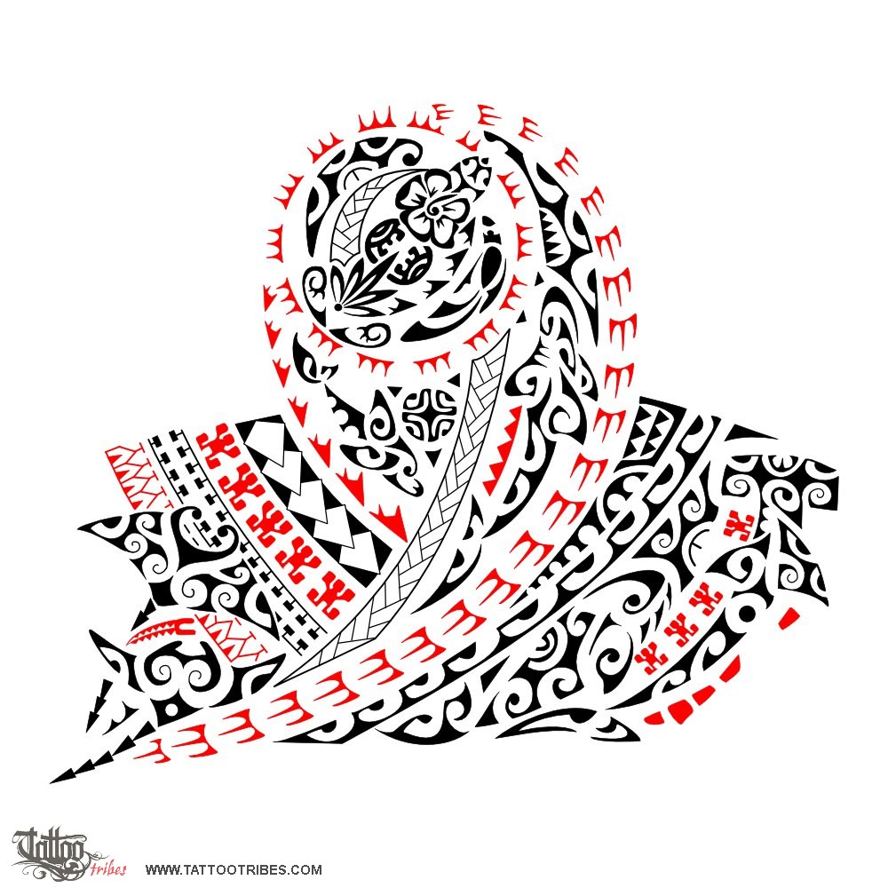 The left flipper contains waves and a tiki hand for protection while the birds in the head of the turtle are for the help that will always be granted to the dear ones.
