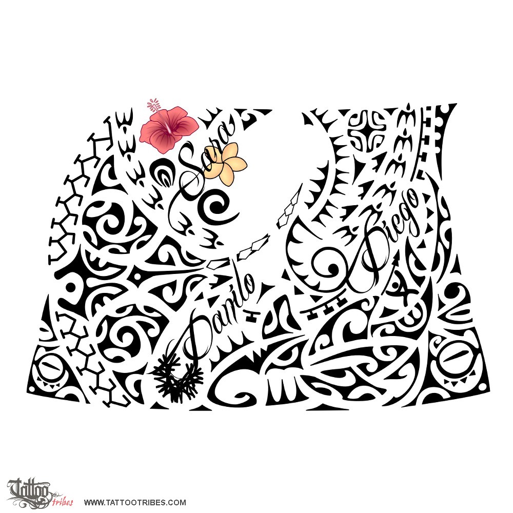 Next to the name Sara, ipu and koru symbolize femininity and fertility while flowers are for femininity, beauty and living life fully (the hibiscus).