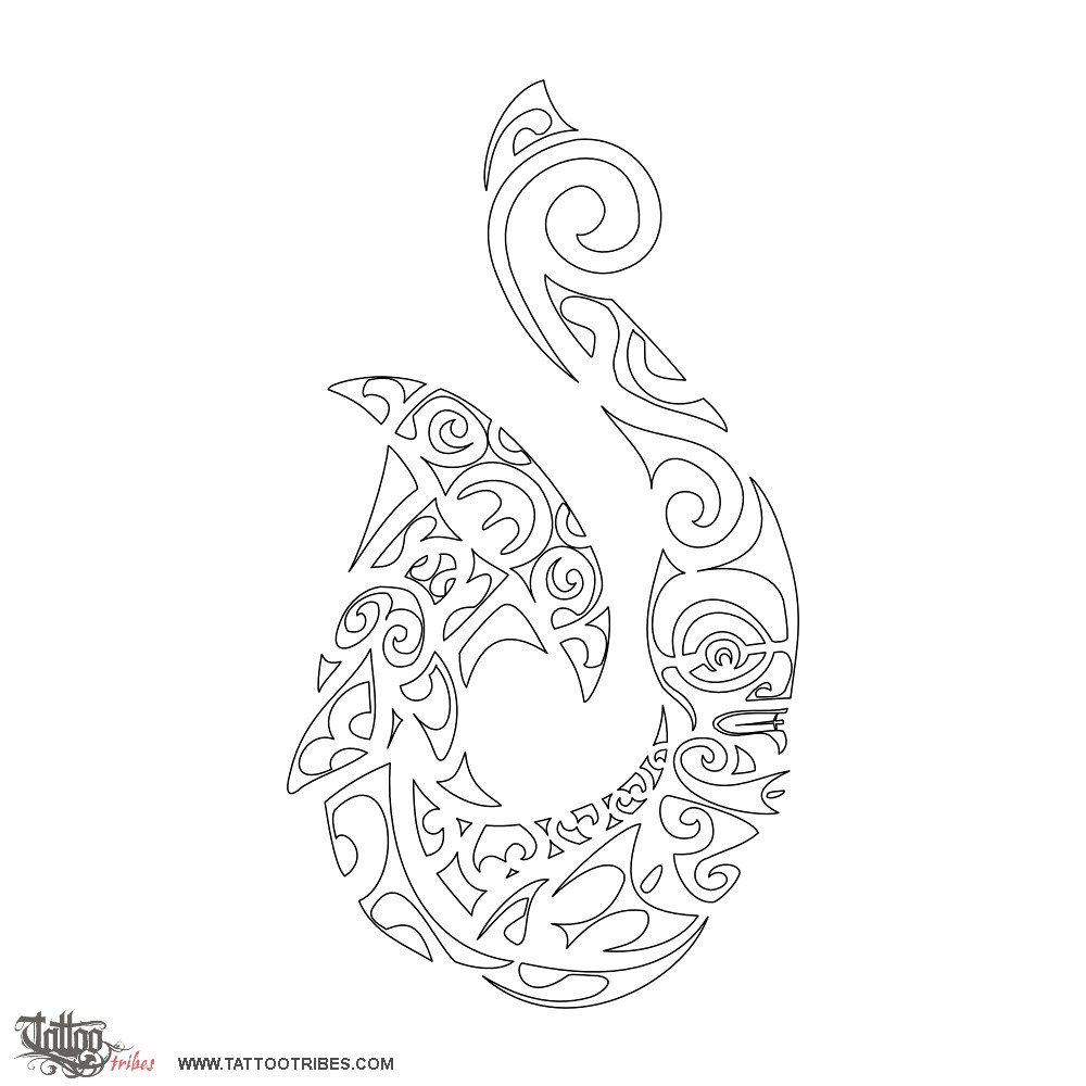 This fish hook tattoo is composed mainly by a tiki (protection), a hammerhead shark (tenacity, strength), a frigate (freedom, watching the world from a higher perspective), waves (change), a turtle (family) and a koru (new life).