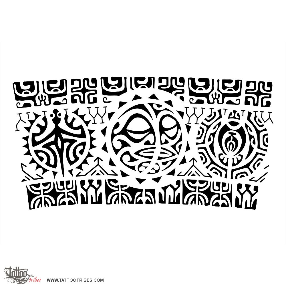The upper band has tiki and Marquesan crosses for protection and balance while the lower one has sugar canes and lizards for prosperity and good luck.