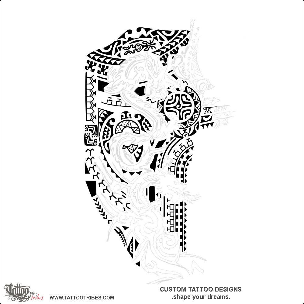 Martin had a solid black Asian dragon and a tribal one tattooed on his back and he asked us to integrate them and a Poly tattoo on his shoulder into a Polynesian design.