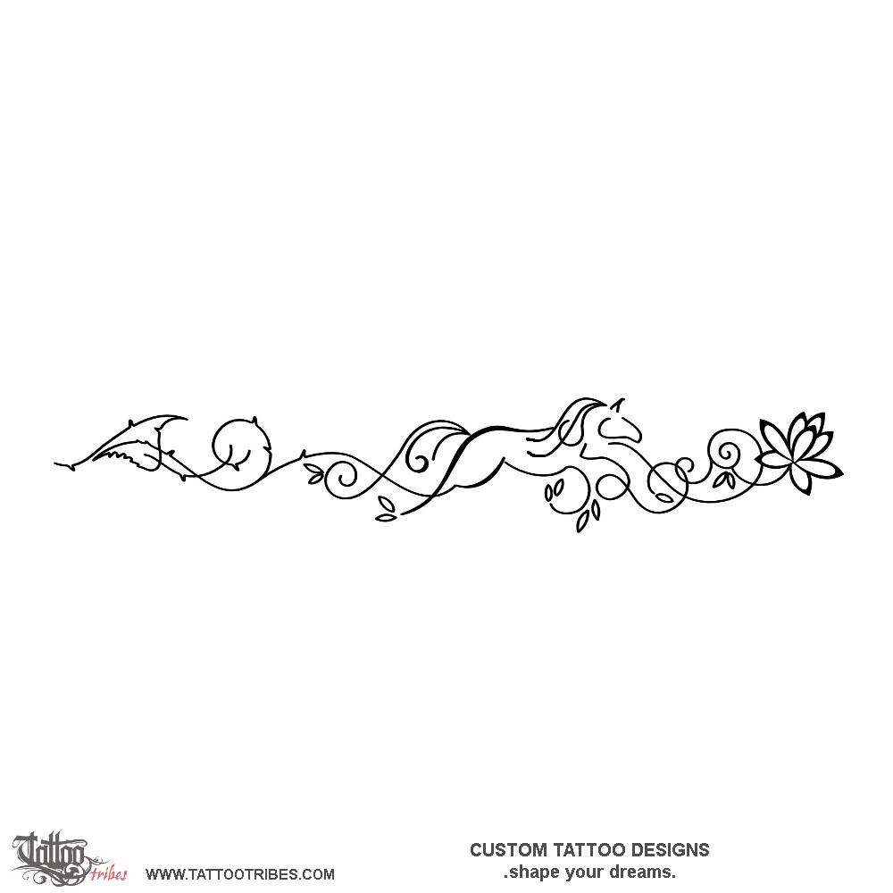 Going to the right, the path starts to smooth down and shapes are more round and delicate, till vines become the lines of a horse representing freedom, with new leaves and sprouts to symbolize a new rebirth ending on the right with a blooming lotus flower that represents victory over adversities, beauty and perfection.
