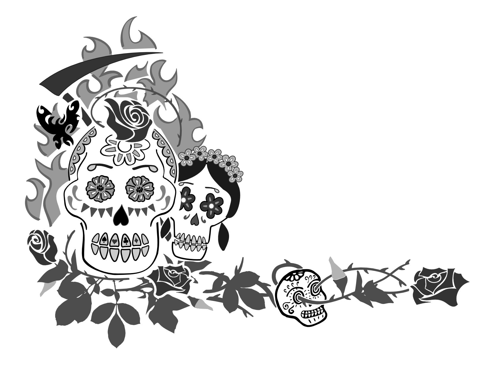The symbols we used recall death (skulls, scythe) but, following the Aztec tradition, they exalt life; in fact, death was seen just as a passage from the material life to a spiritual better level. This is the reason for material symbols such as the seed of the cards, roses to symbolize love and perfection, and the butterfly and fire as symbols of transformation and renewal.
