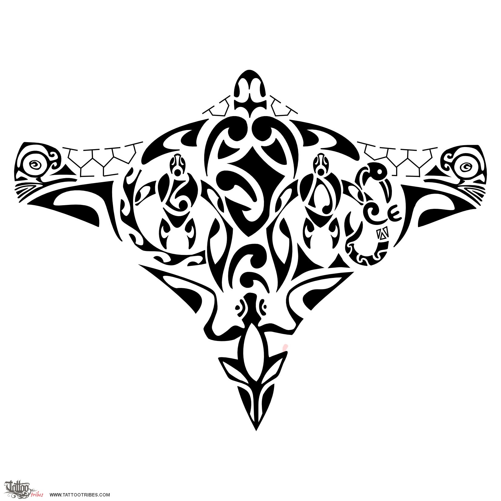 The left turtle has an "L" on its shell, and it´s surrounded by a sun (for light), whereas the right one has a "D" and it´s surrounded by a manaia (guardian). The tikis on both sides are for protection and the lizard on the bottom is there to bring good luck to the family. The two korus above it are different in size on account of the different ages of Joao Pedro´s children.