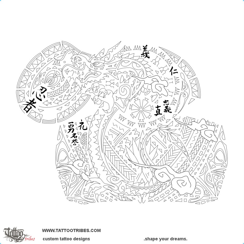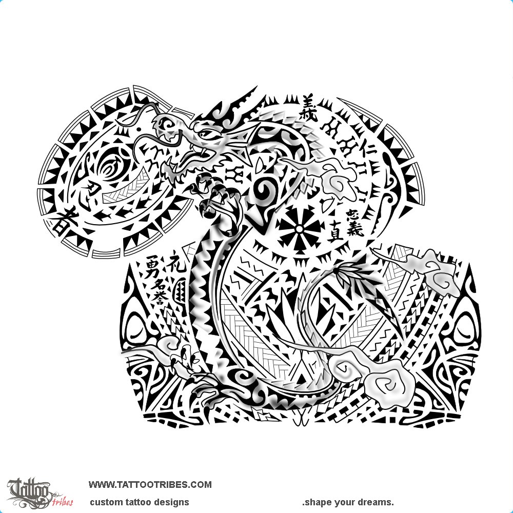 This Polynesian halfsleeve and pec tattoo prepared for Ryan includes elements derived from Asian traditions, like the dragon and the clouds, plus some ideograms woven within the elements, like the seven ideograms for the seven virtues of bushido, each one with Polynesian symbols nearby representing that virtue: ponapona symbolizes union and loyalty, and it´s next to Chu and Makoto (for honesty and loyalty); a sun and people are next to Gi and Jin (for integrity and compassion); the mere (status, respect and honor) is next to Rei and Meiyo, and the spearheads (warrior, strength and courage) are close to Yu.