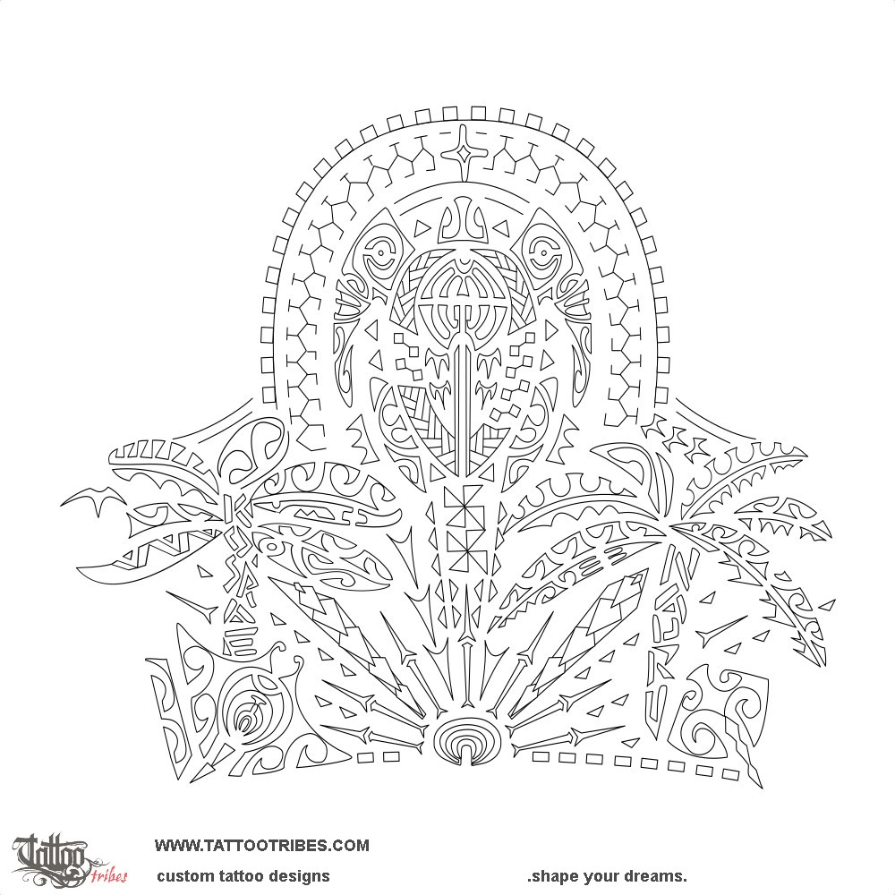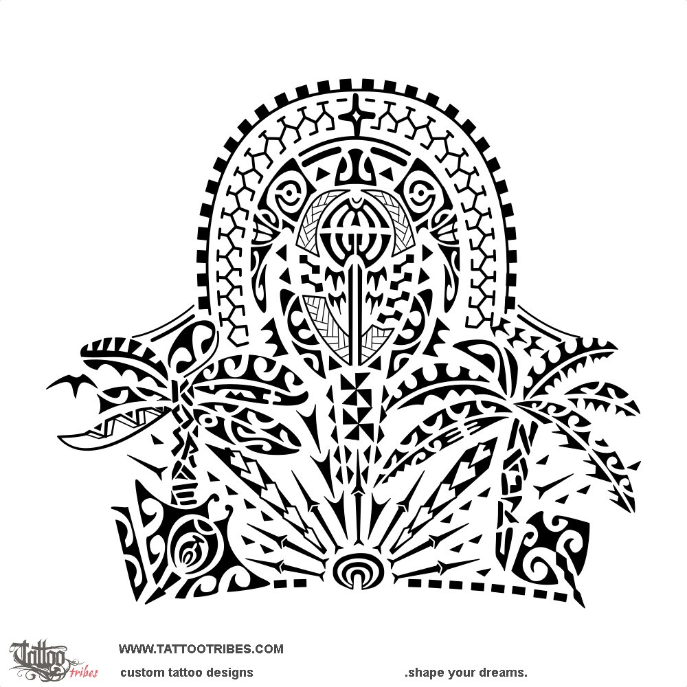 The turtle represents his family, with his children and grandchildren depicted within the shell next to him and his wife, and with ancestors guarding the family from above (the star within them symbolizes their importance) and the tiki on the front flippers protecting it from all directions.