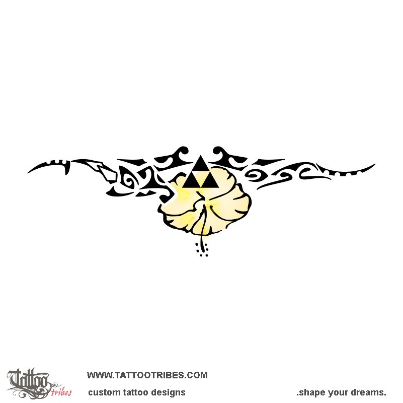 The hibiscus flower symbolizes beauty, femininity and carpe diem, and on its sides we placed a hammerhead shark (tenacity, strength) and a lizard (good luck and health, seeing beyond reality).