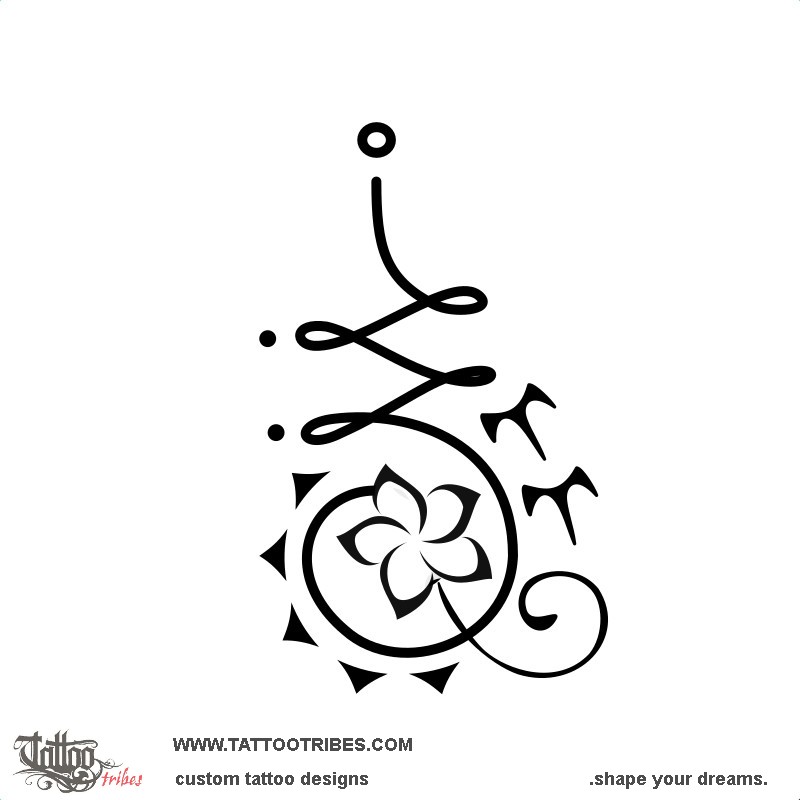 The base for this small tattoo prepared for Marina is a unalome, a symbol that represents a path to perfection, with a letter M and a frangipani included to represent her daughter.